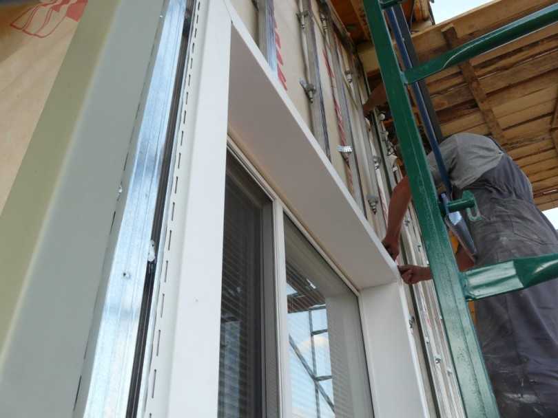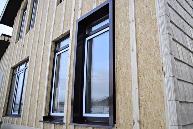 Обрамление окна начинается с монтажа отлива. Он выступает за рамки оконного проема на 8-10 см с обеих сторон. На этот выступ устанавливаются боковые приоконные планки. Снизу отлив удерживается j-профилем. После монтажа сайдинга, оформление окна завершается установкой наличников.