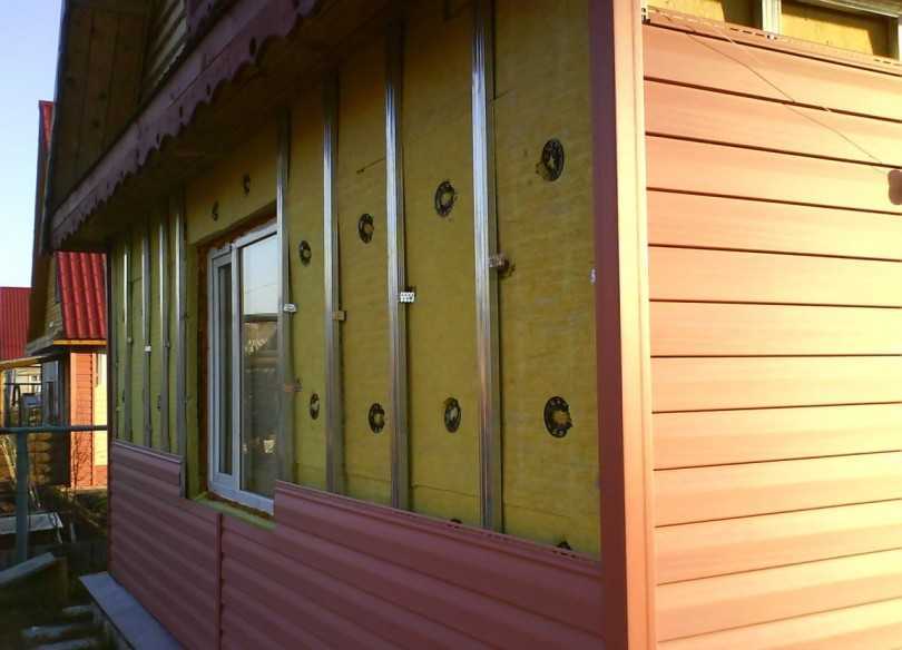 - Между стойками и под обрешётку укладывается минеральный утеплитель, в местах стыковки накладывается внахлёст. К стене крепится дюбелями-зонтиками.