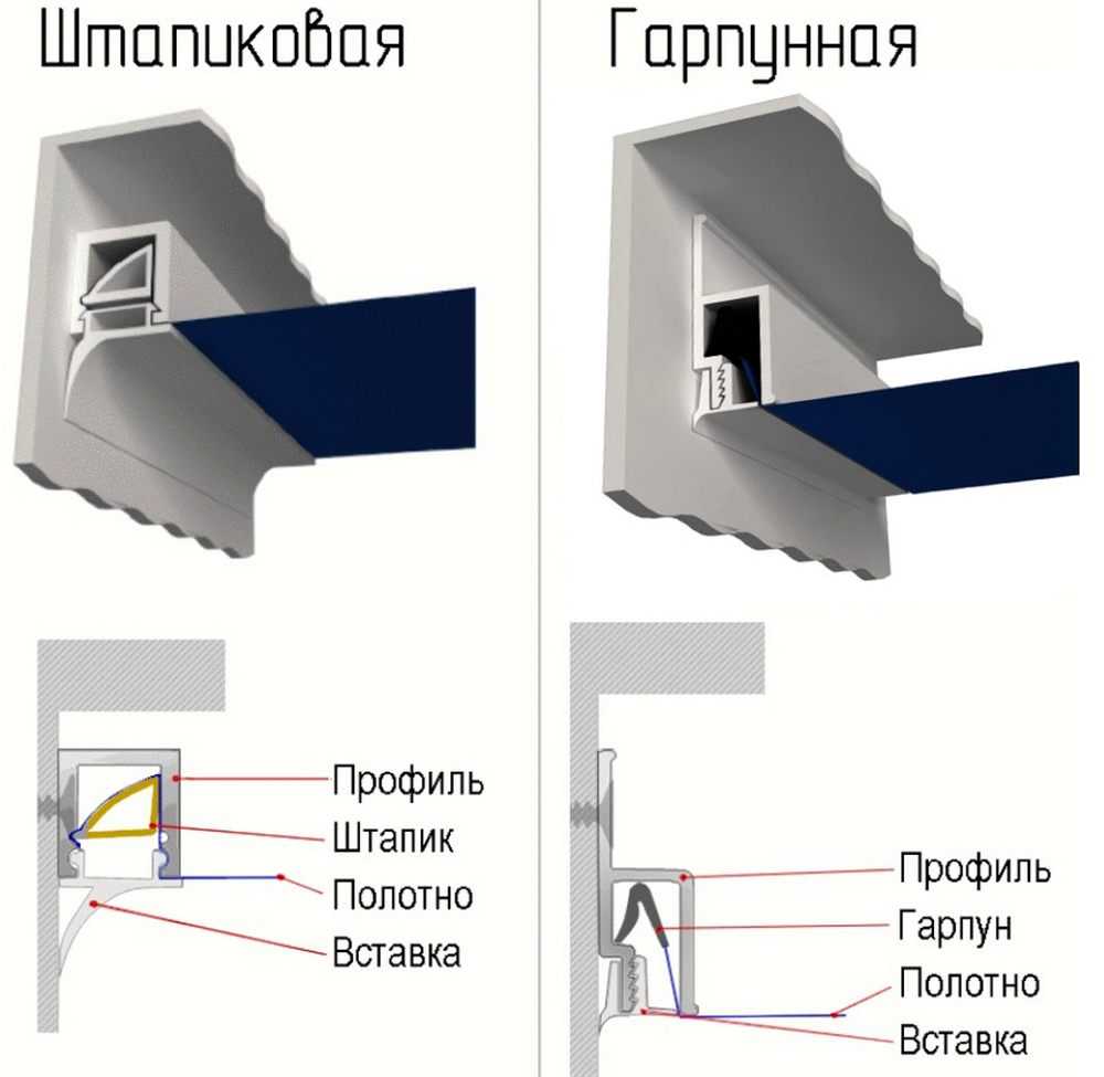 Когда выполняется устройство натяжного потолка — технология предполагает крепление ПВХ пленки при помощи гарпунного способа. Гарпун представляет собой жесткую пластиковую пластину, имеющую особую форму, которую крепят сваркой по периметру полотна. Этот крепежный элемент необходим для фиксации пленки в багете.