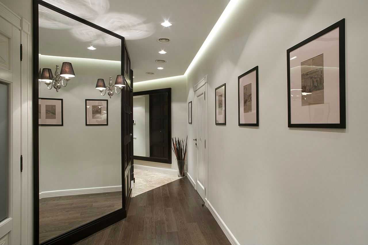 Когда данное помещение узкое, можно расположить по его центру софиты — точечные приборы и создать тем самым световую дорожку. При этом внизу на стенах в случае необходимости делают дополнительную подсветку. Подобное размещение осветительных изделий допустимо и на многоуровневом потолке – он будет выглядеть нестандартно.