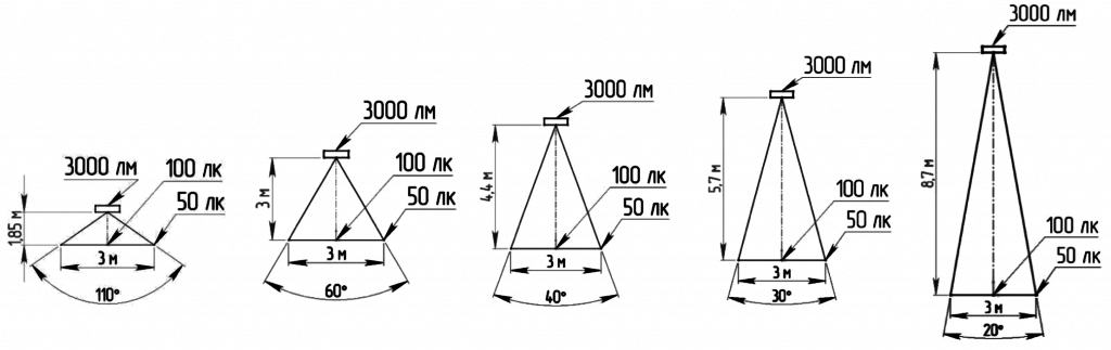 При расчетах нужно учитывать и такой показатель, как угол освещения. Некоторые точечные светильники захватывают небольшое пространство, поэтому лучше подбирать модели с небольшой мощностью, чтобы расположить их ближе друг к другу.