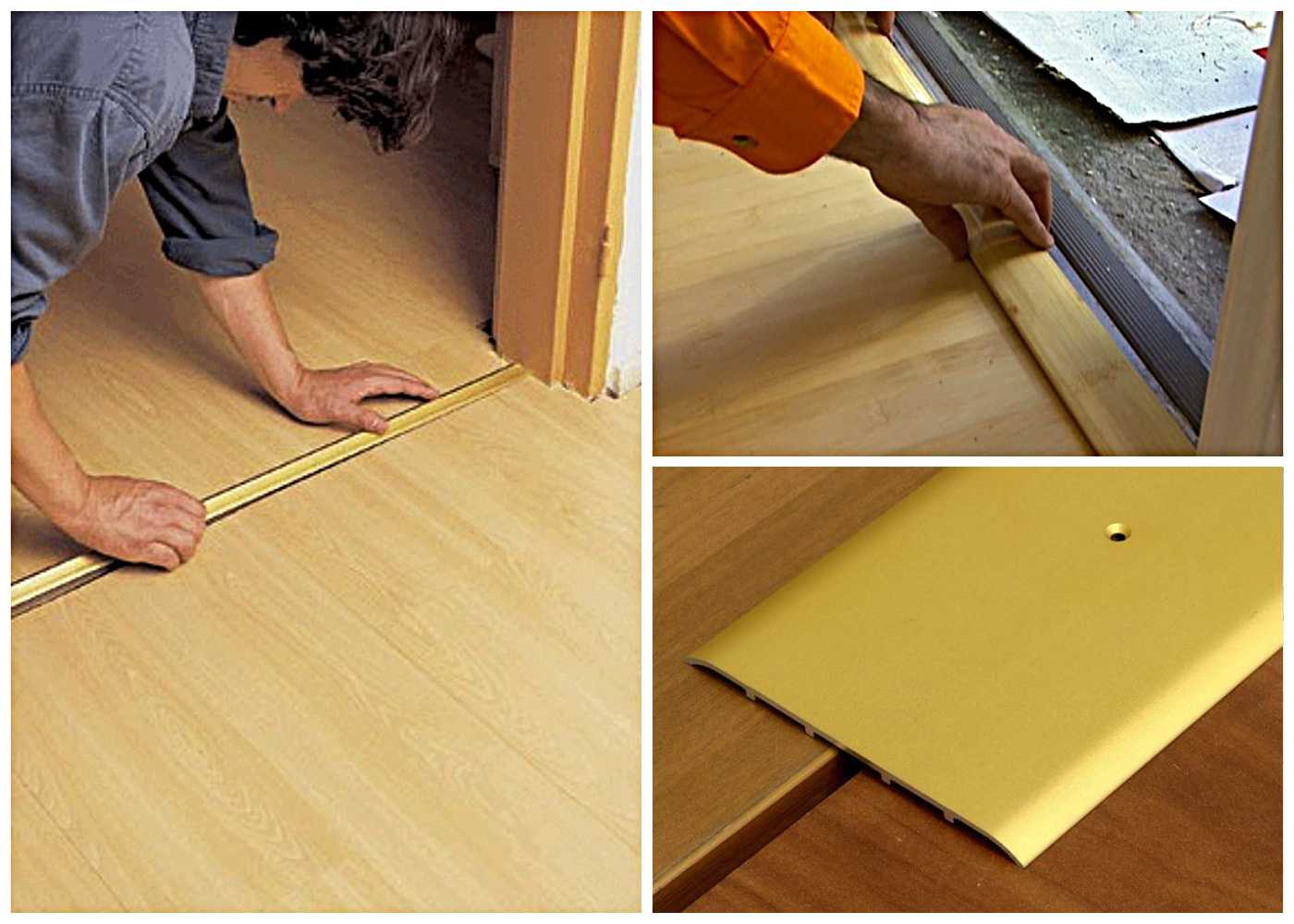 Алюминиевые и пластиковые профили могут быть гнущимися, а деревянные пороги не гнутся, поэтому требуют ровного соединения ламината и плитки. Надёжнее и проще крепить их к поверхности чернового основания на саморезах или дюбелях. При этом можно даже добиться, чтобы порожек размещался на одном уровне с покрытиями по обе стороны.