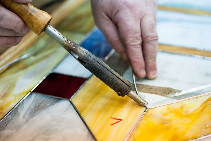 Из окантованных деталей формируется витраж и начинается пайка. Стыки стекол смазываются паяльной жидкостью (с ее помощью припой будет проще растекаться). В качестве припоя выступает оловянно-свинцовая проволока. Нагревается паяльник (его мощность должна быть не менее 75 Вт). Расплавленное паяльником олово распределяется на стыках стеклянных фрагментов (как показано на фото). Медь при этом должна полностью скрыться под припоем. Пайка проводится как с лицевой, так и с обратной стороны.