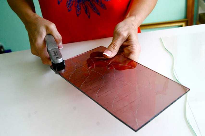 - По лицевой стороне стекла (обратная может быть не совсем ровной) при помощи стеклореза проводятся линии. Место реза простукивается, после чего необходимая деталь просто отламывается руками. Для работы с криволинейными деталями придется сделать несколько резов по лекалу.