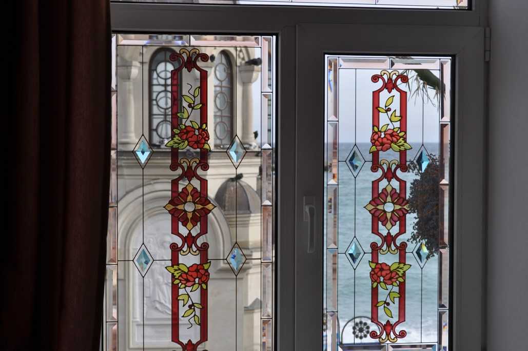 Пленочный витраж: поверхность стекла оклеивается специальными цветными пленками с клеящей основой.