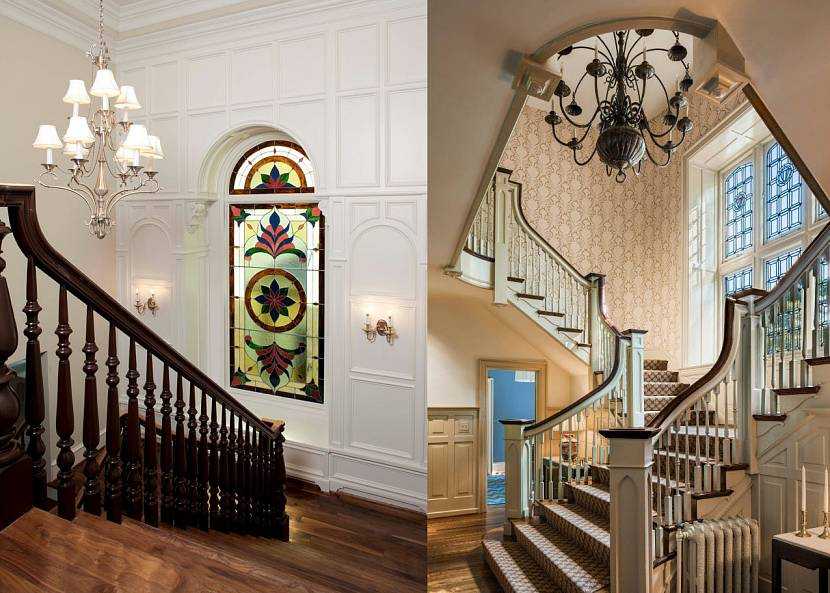 Для загородных особняков больше подойдут витражи в светлых красках, которые зрительно будут увеличивать пространство комнаты. В таких комнатах портьеры будут лишними и будут лишь затенять помещение.