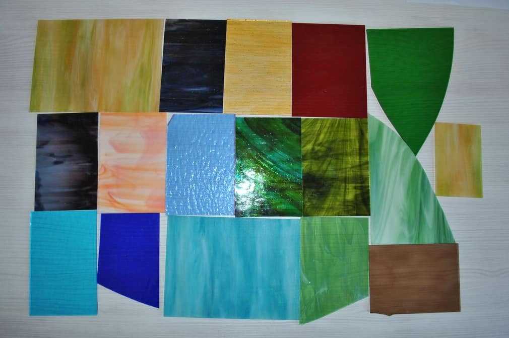 Подбираются разноцветные стекла. Выбор материала определяется исключительно фантазией мастера. Толщина стекла обычно составляет 4…5 мм. Можно использовать и фрагменты, имеющие различную толщину.