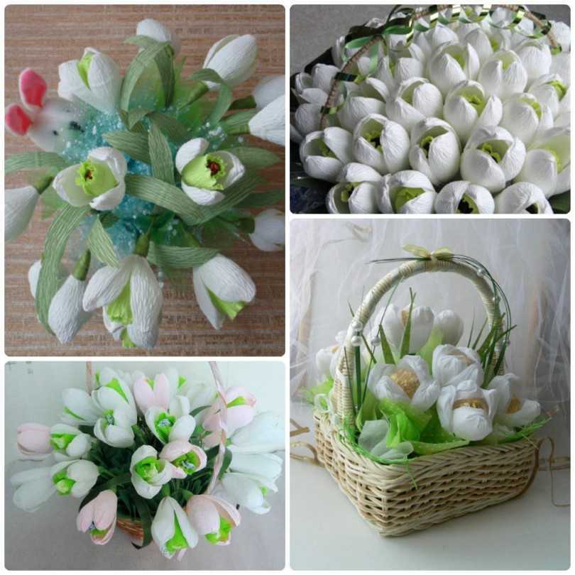 Сделав несколько подснежников, из них можно собрать красивый букет.