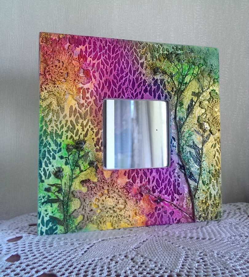 На фото квадратная зеркальная модель с рамкой, оформленной в технике декупаж.
