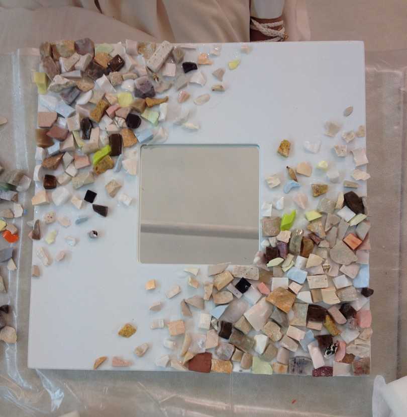 Поверх заготовки наклейте мозаичные составляющие при помощи обычного клея, небольшие бусины и камешки с перламутром не будут лишними, кроме того по своему усмотрению можно использовать и другие детали. В завершении процесса необходимо выполнить затирку рамочной поверхности и протереть её мягкой тряпкой.