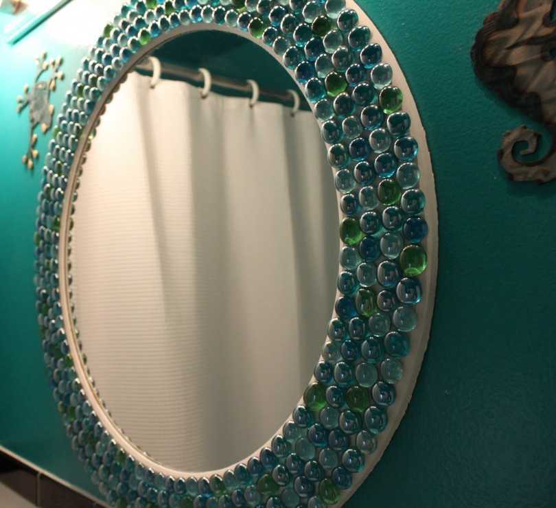Цветные, хрустальные, фарфоровые, глиняные осколки или другие виды битого стекла, являются отличным вариантом для декора зеркала. Данный оформительский прием привнесет в помещение некой новизны и неповторимой колоритности.