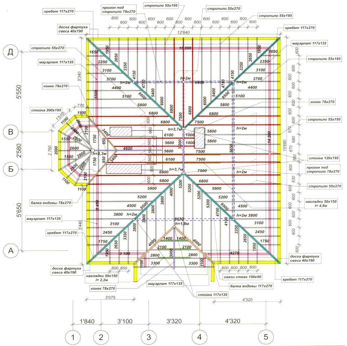 При составлении чертежей стропильной системы четырехскатной крыши следует четко обозначить геометрическую форму, а также указать положение отдельных элементов и проекции скатов с точными размерами.