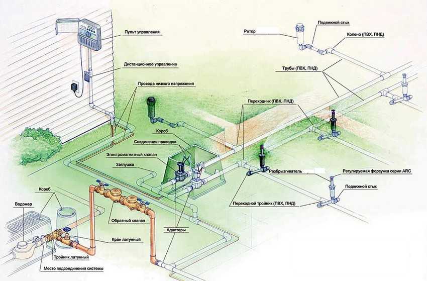 система трубопроводов или шлангов для доставки воды к поливочным устройствам. Для объединения труб в разветвленную сеть потребуются тройники, уголки (отводы), муфты и пр.;