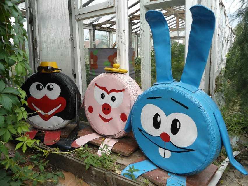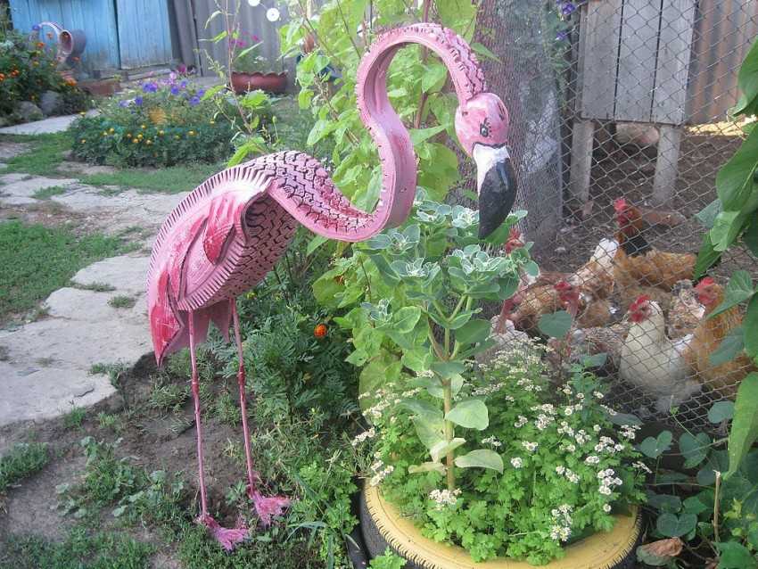 Самый популярный материал для изготовления поделок для огорода — это старые шины от автомобиля. Каких только моделей украшений из них не придумано.