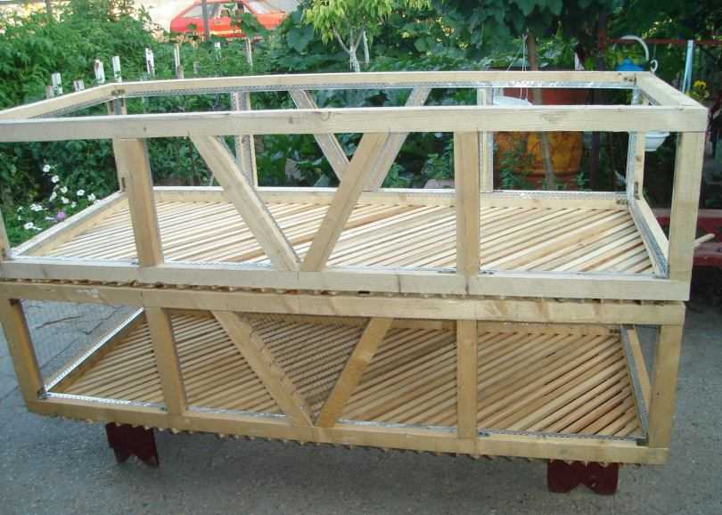 Для производства необходимо два вида оцинкованной сетки с ячейками разного размера. Крупноячеистая (2,5-5х5 см) крепится на стены и потолок, а мелкая (1,5-2,5 см) – на пол. Каркас делают из прочного бруса, с ножками высотой 50-70 см. В теплое время года конструкцию устанавливают на улице (под навесом), в холодное – заносят в утепленный сарай.